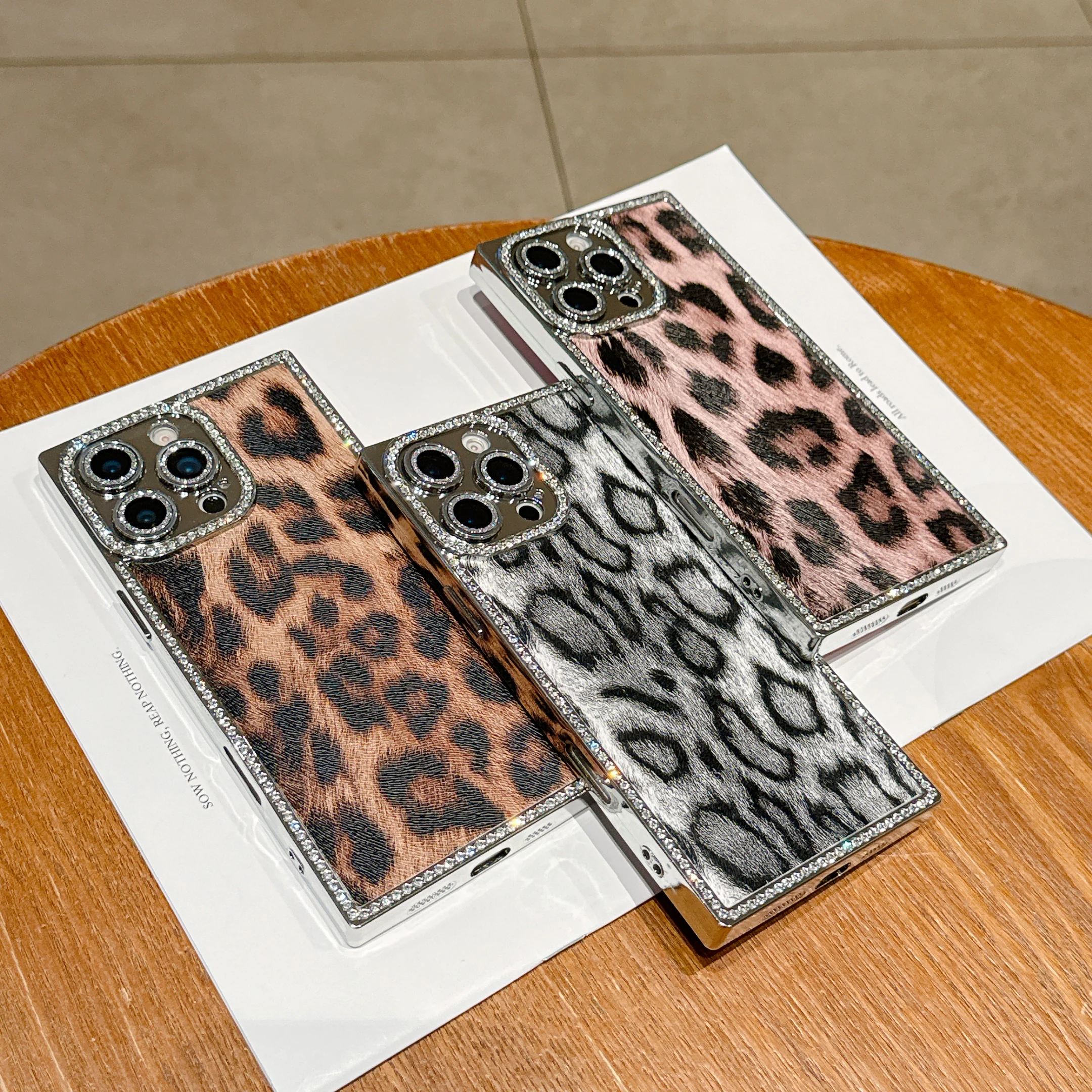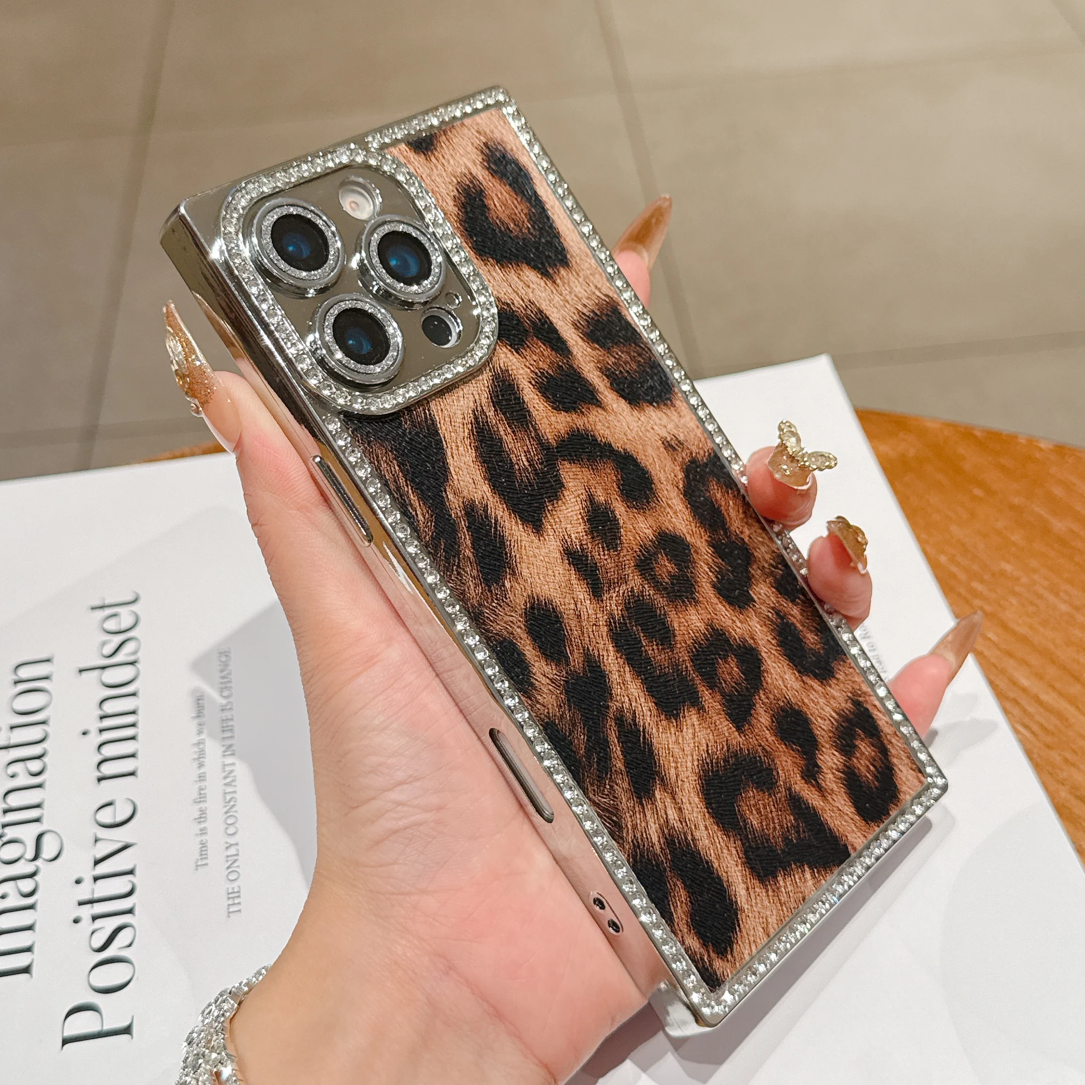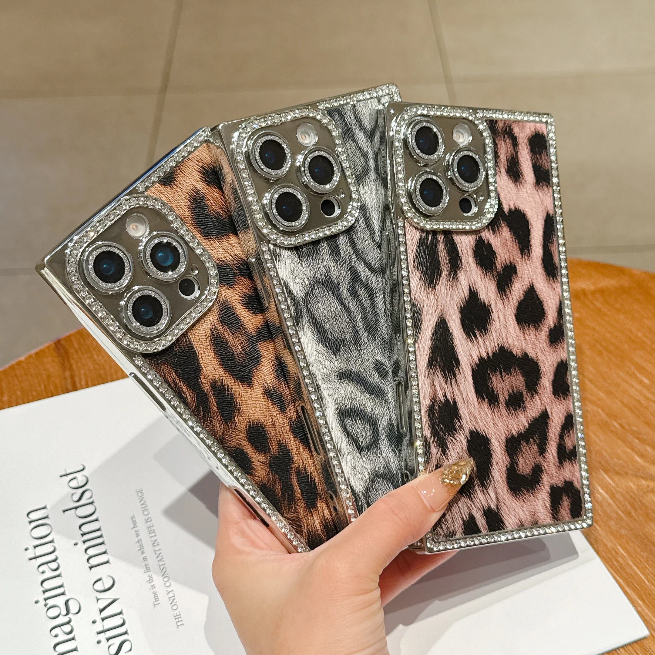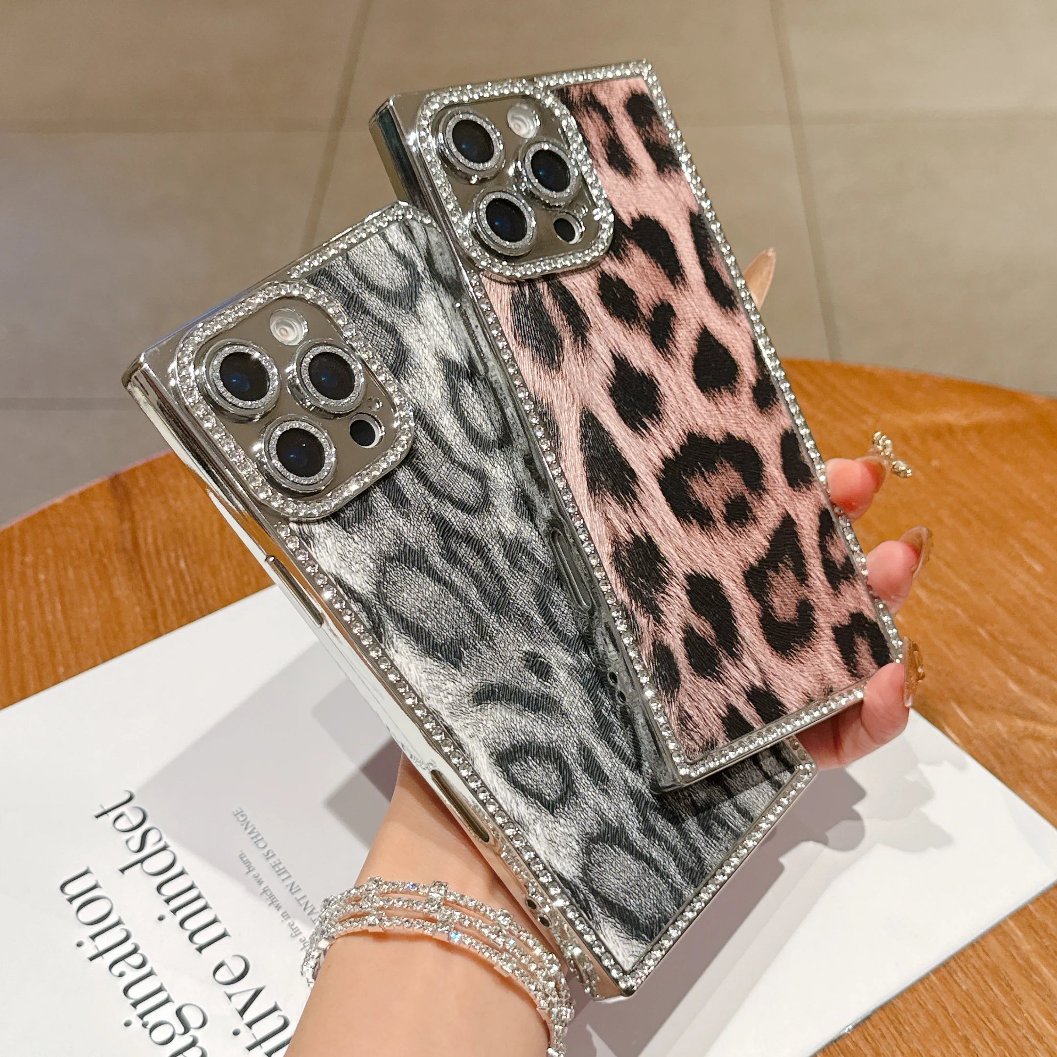 Luxury Diamond Leopard Print Pattern Phone Case For iPhone 16 15 14 13 Pro Max Plus Camera Protection Plating Shockproof Cover